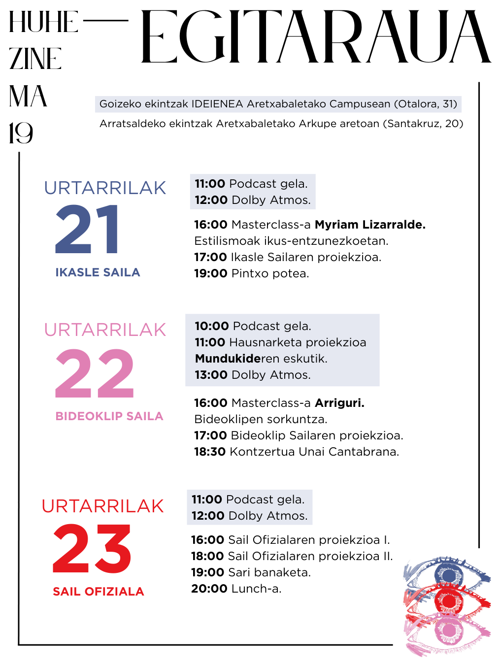 Aurten, berritasun modura, goizak Aretxabaletako IDEIENEA Campusean ospatuko ditugu (Otalora, 31), eta arratsaldeak Arkupe Aretoan (Santakruz, 20).